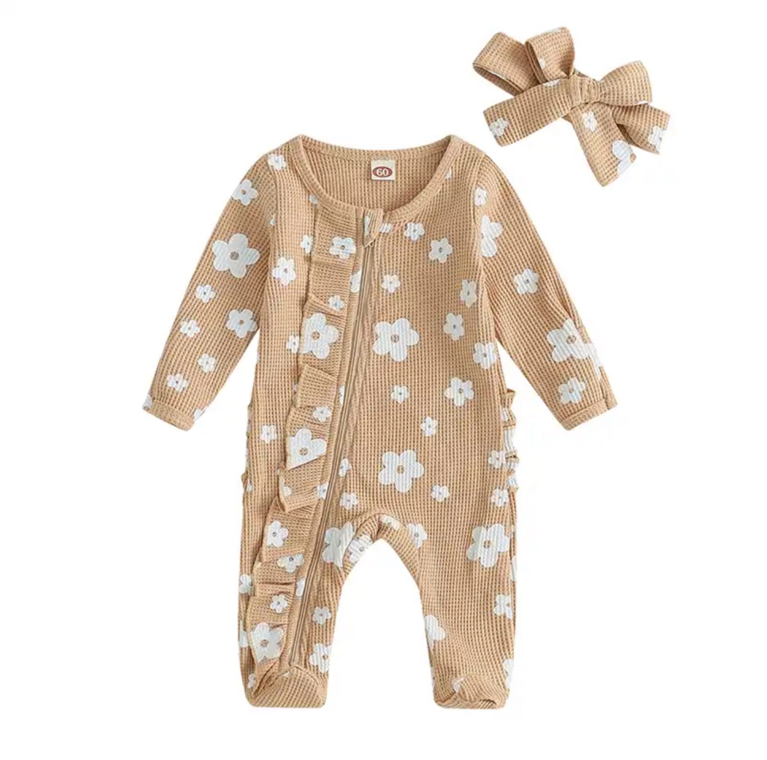 Introducing the adorable baby girl’s beige daisy romper, a perfect blend of comfort and style for your little one. This charming romper features a delightful daisy pattern that adds a touch of elegance. The soft, breathable cotton fabric ensures that your baby stays comfortable. The romper is designed with easy an easy zip up design, making diaper changes a breeze