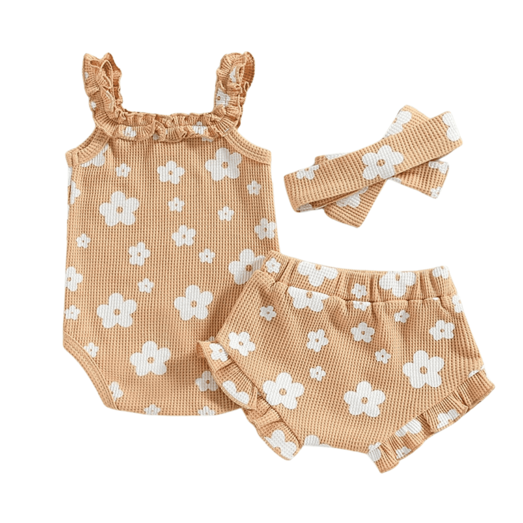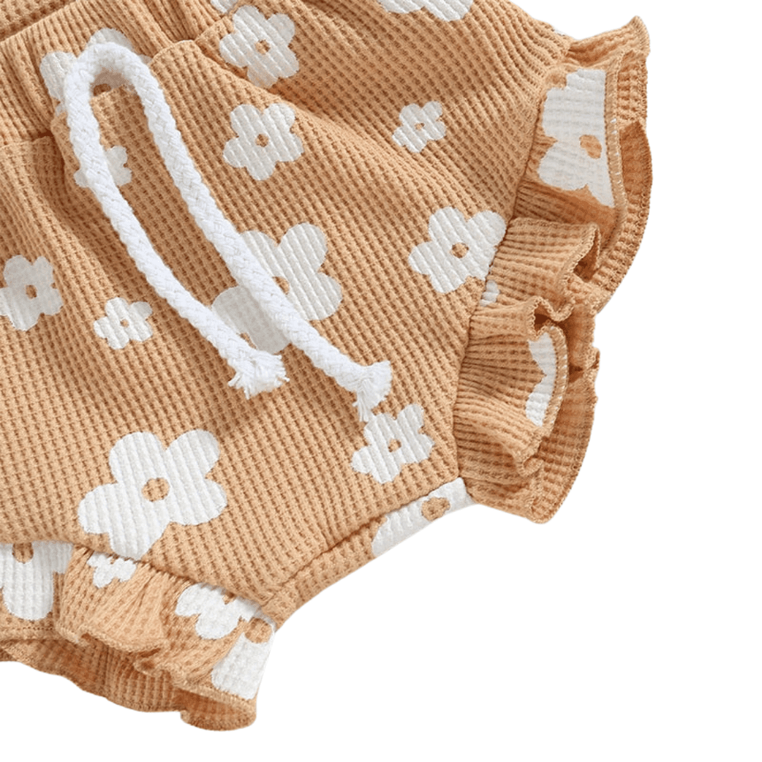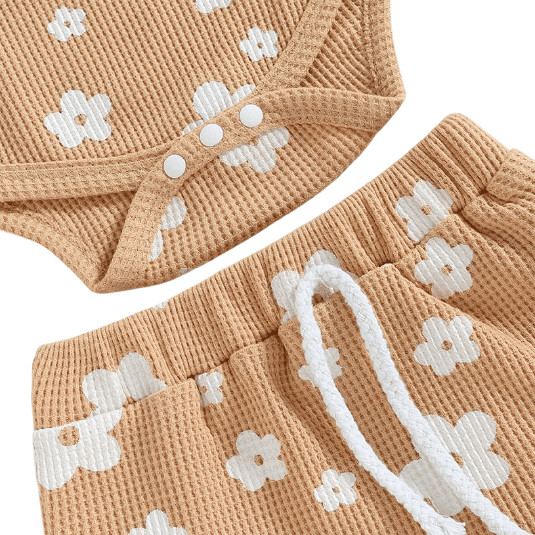 The set includes a romper top and a bummies bottom, both made from the same high-quality cotton fabric. The romper features a square neckline with snaps for easy nappy changes, while the bottom has an elastic waistband for a snug and comfortable fit. The gentle stretch of the fabric ensures that your baby can move around comfortably.