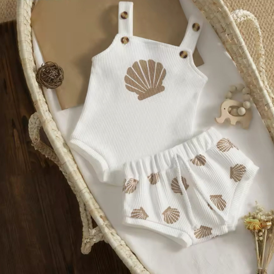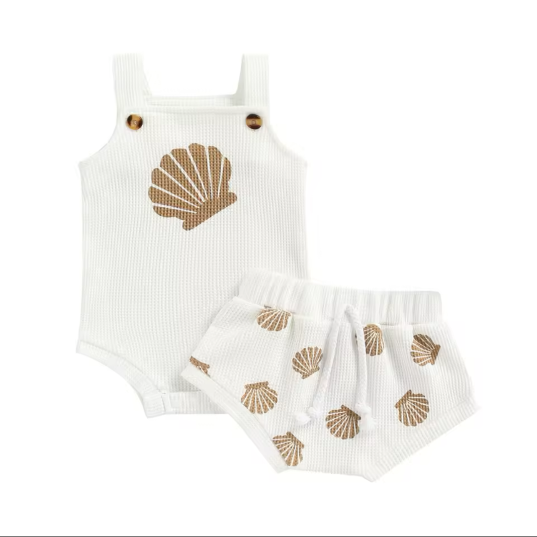 Our Baby shell romper and bummies set in white, the perfect addition to your little one’s wardrobe! Made from soft and breathable cotton and spandex, this set is designed to keep your baby comfortable all day long.